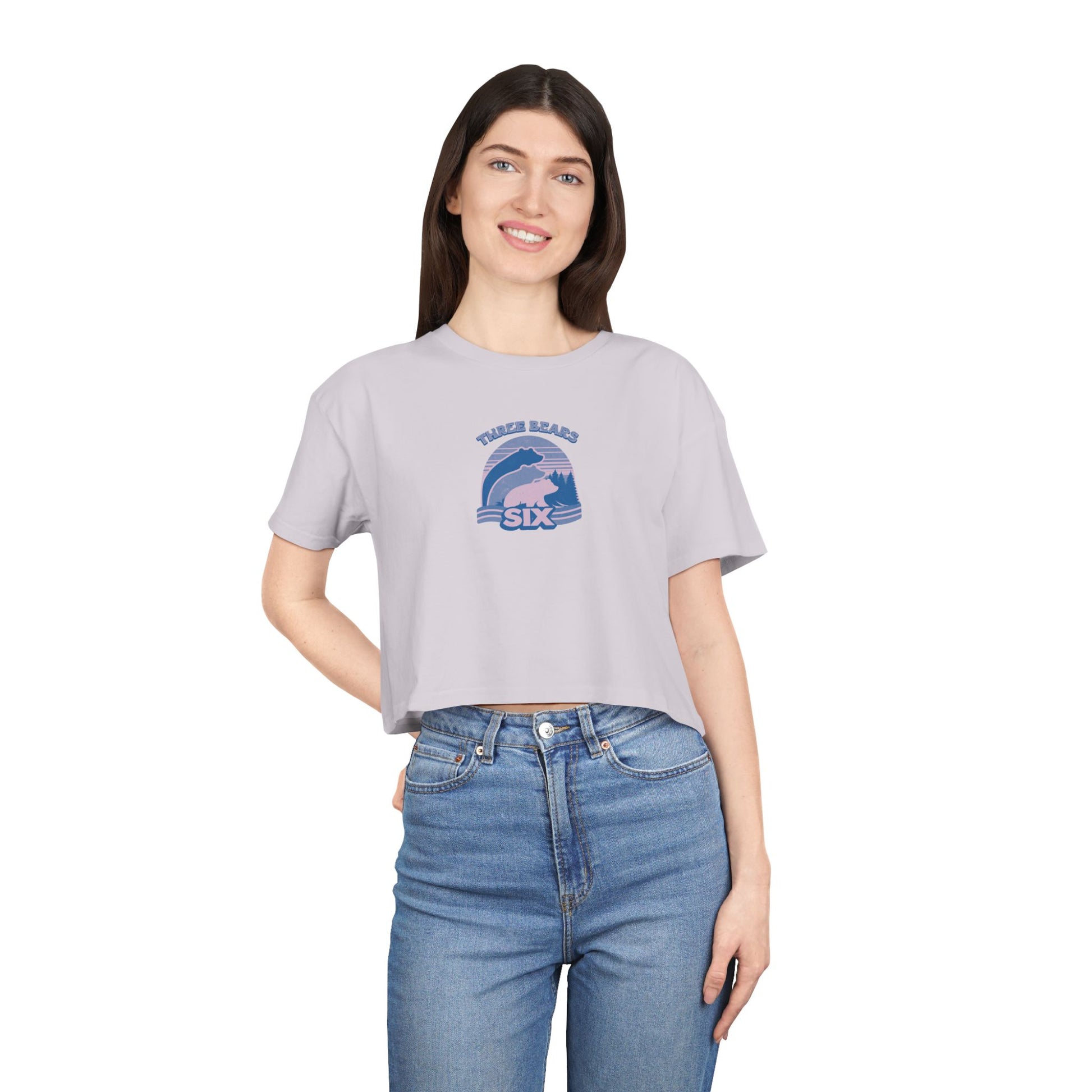 Crop Tee — 'Three Bears Six' Retro Sunset Graphic